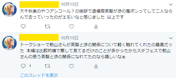 2.5に興味がなかった私を引っ張ってくれて、それも最初は某氏の歌を目当てに手を付け始めた人間なので今こうして、京都劇場にいて、fineの――三人の卒業のために私が泣いてることが(私何様って感じですが)、それこそ前…さんのキャラへの愛の証だよ!って感じでした。